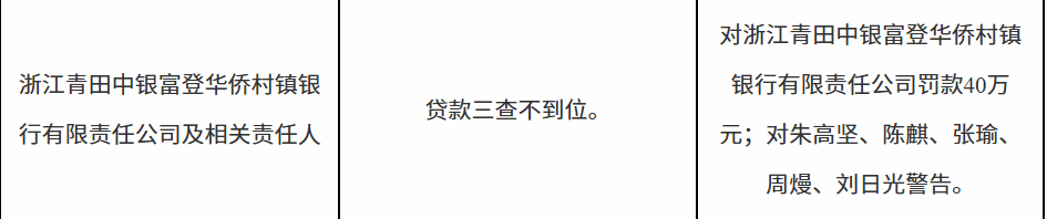 公司配资 浙江青田中银富登华侨村镇银行因贷款三查不到位被罚款40万元